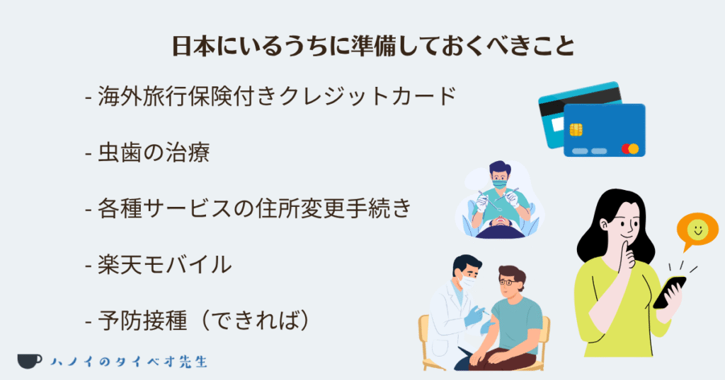 まず、日本にいるうちにしっかり準備しておきたいことは以下の点です。